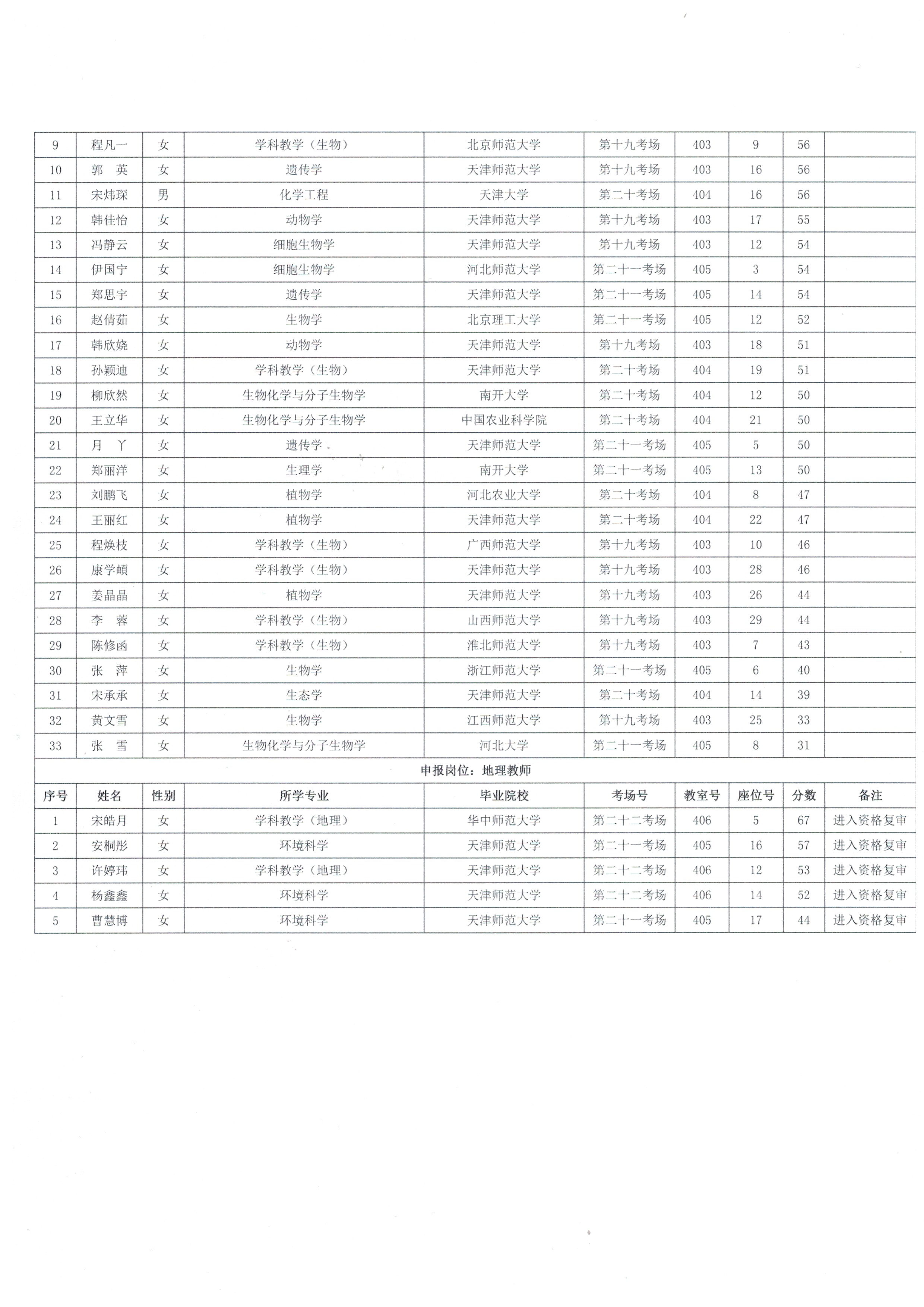 天津市天津中学2021年公开招聘笔试成绩及进入资格复审人员名单