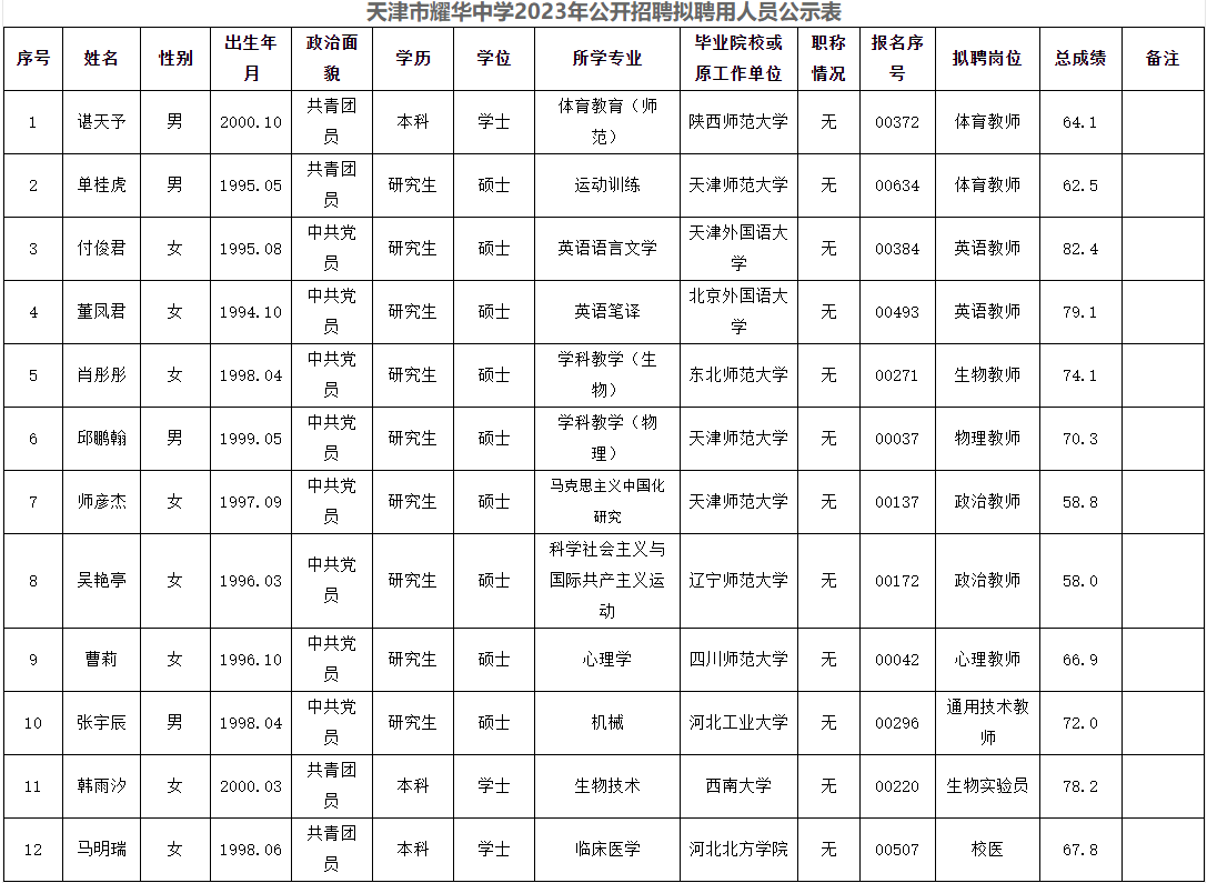 2023年天津市耀华中学公开招聘拟聘用人员公示