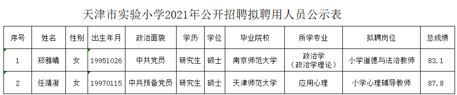 附件:天津市实验小学2021年公开招聘拟聘用人员公示表