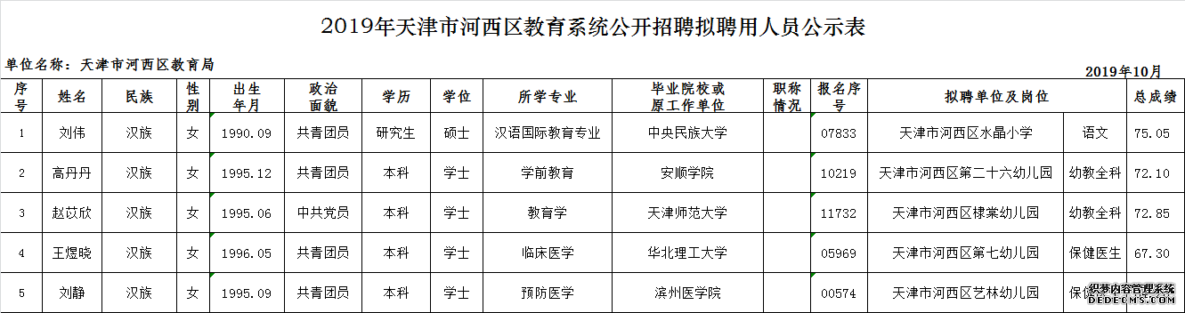根据《2019年天津市河西区教育系统公开招聘(工作人员)工作实施方案》工作安排,下列人员经笔试、面试、体检、考察等程序确定为拟聘人员,现予公示。