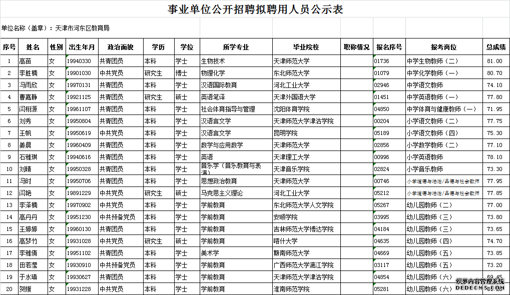 - 天津市河东区2023年教育系统公开招聘事业单位工作人员拟聘用人