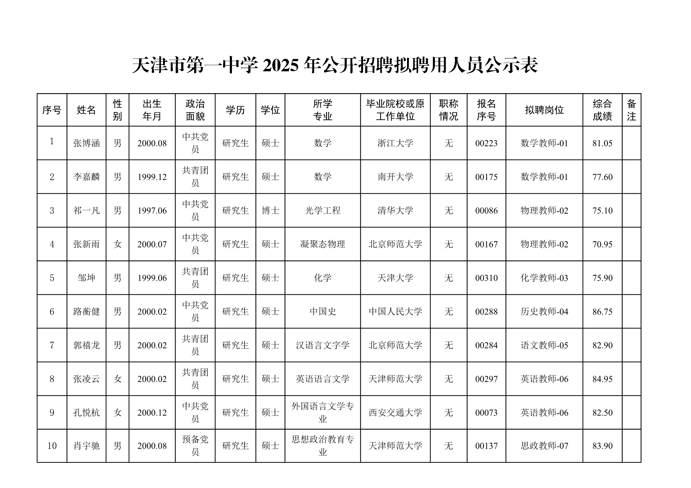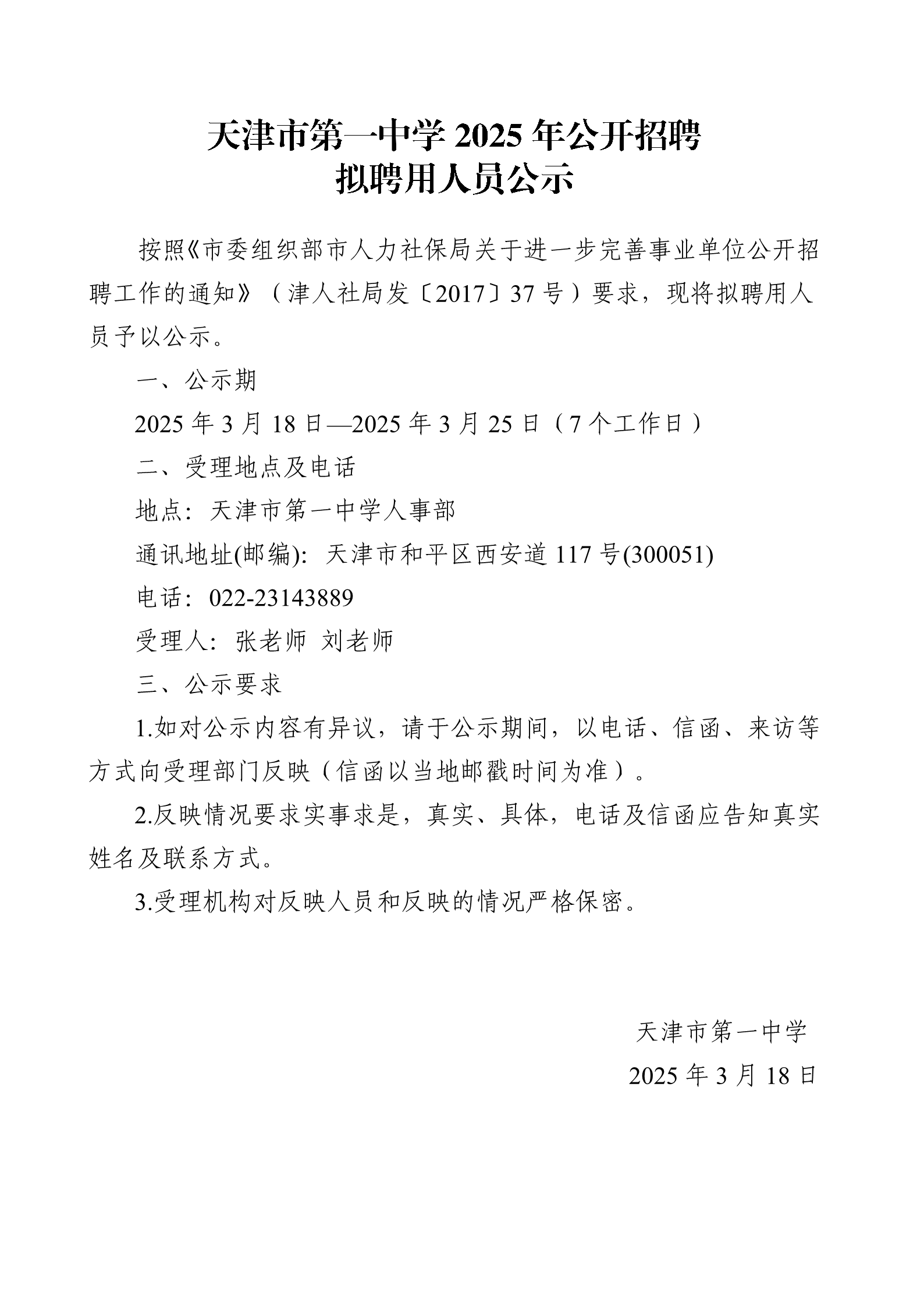 天津市第一中学2025年公开招聘拟聘用人员公示