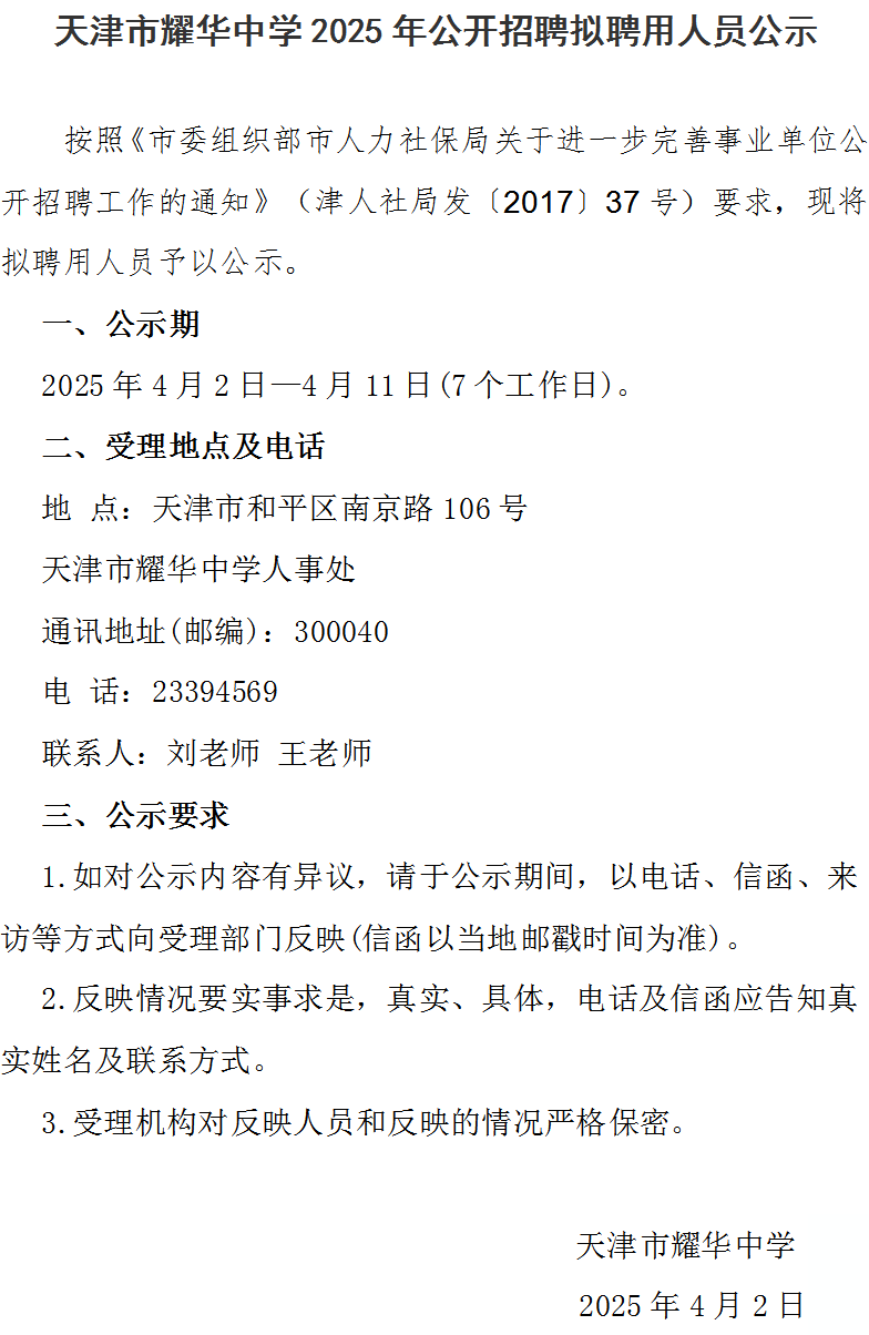天津市耀华中学2025年公开招聘拟聘用人员公示