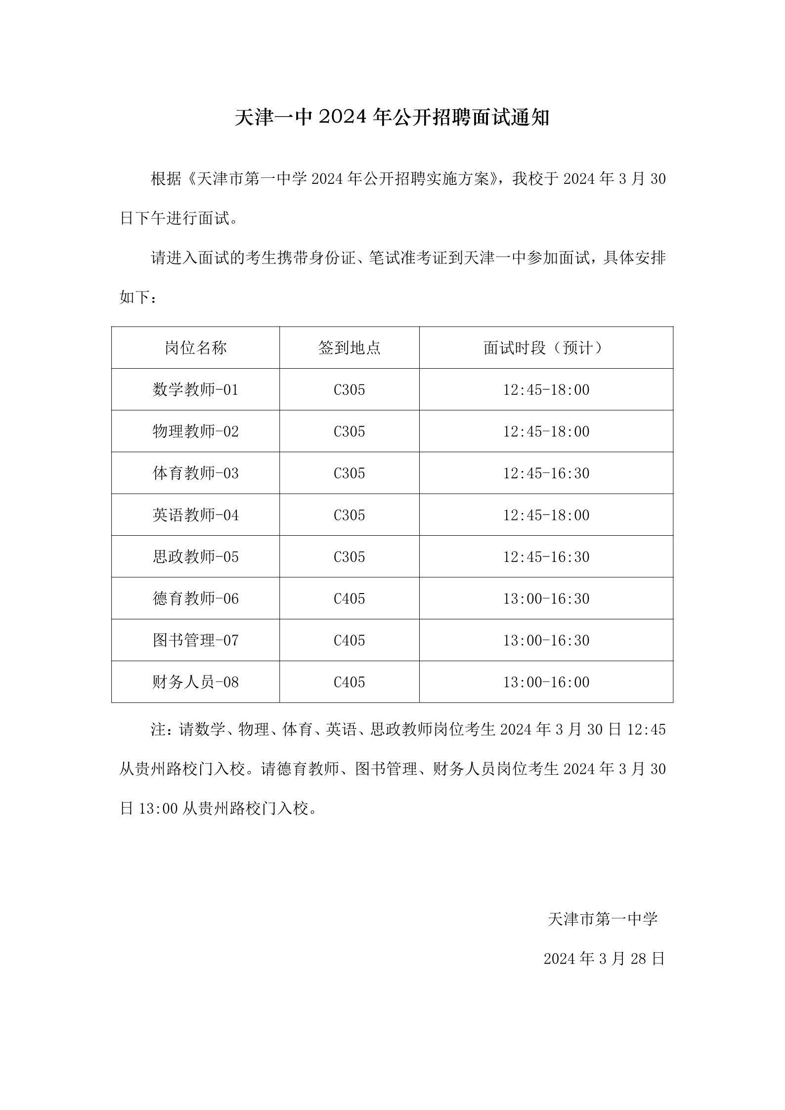 天津一中2024年公开招聘面试通知