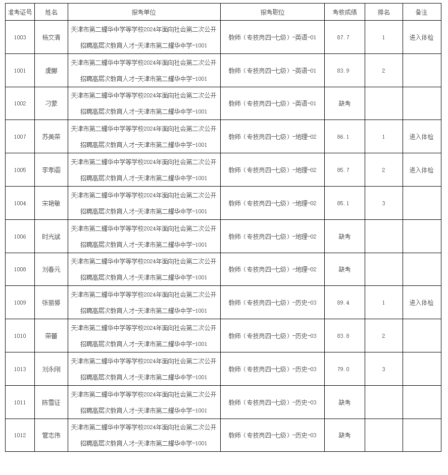 天津市第二耀华中学等学校2024年面向社会第二次公开招聘高层次教育人才考核成绩公示