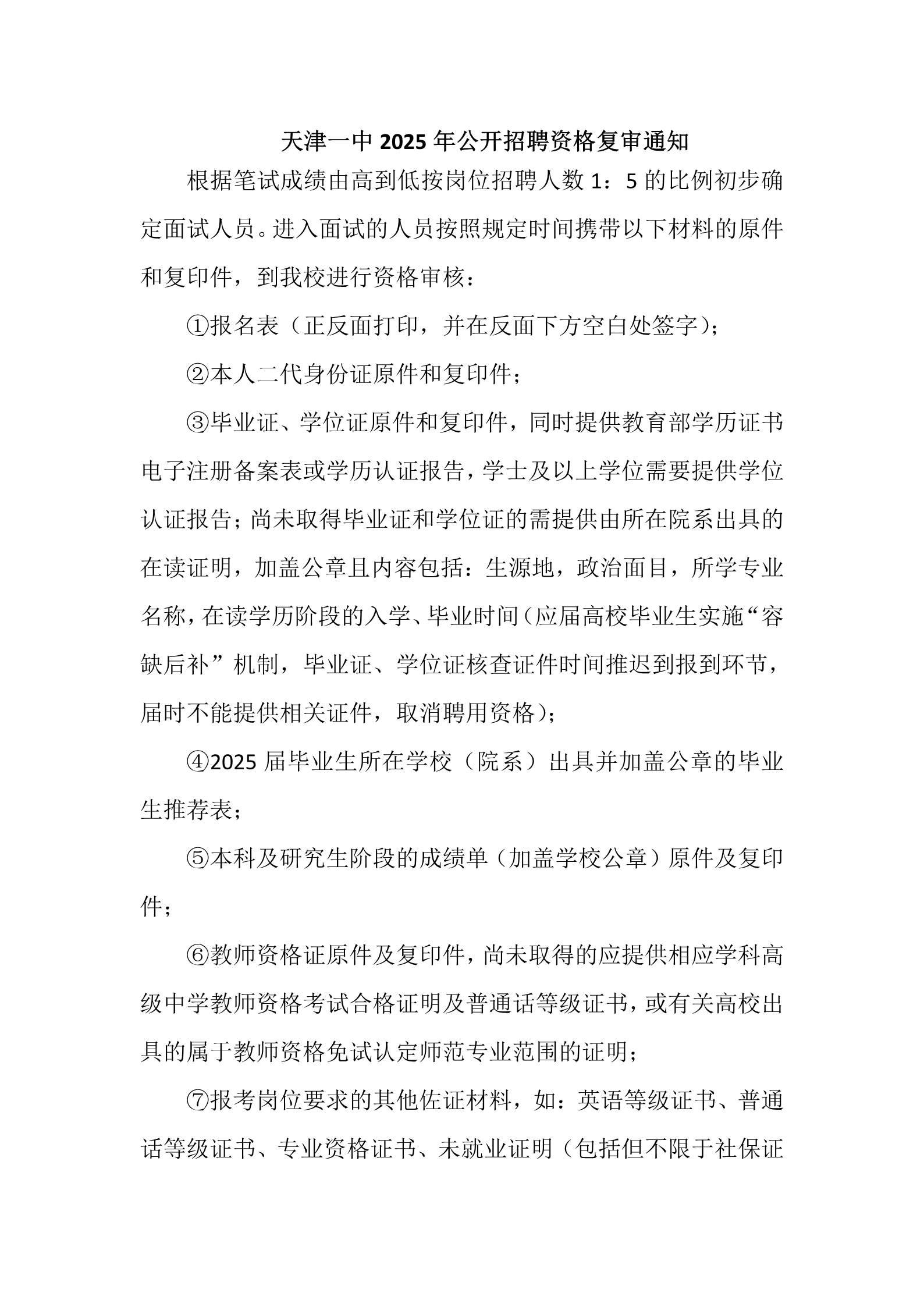 天津一中2025年公开招聘资格复审通知