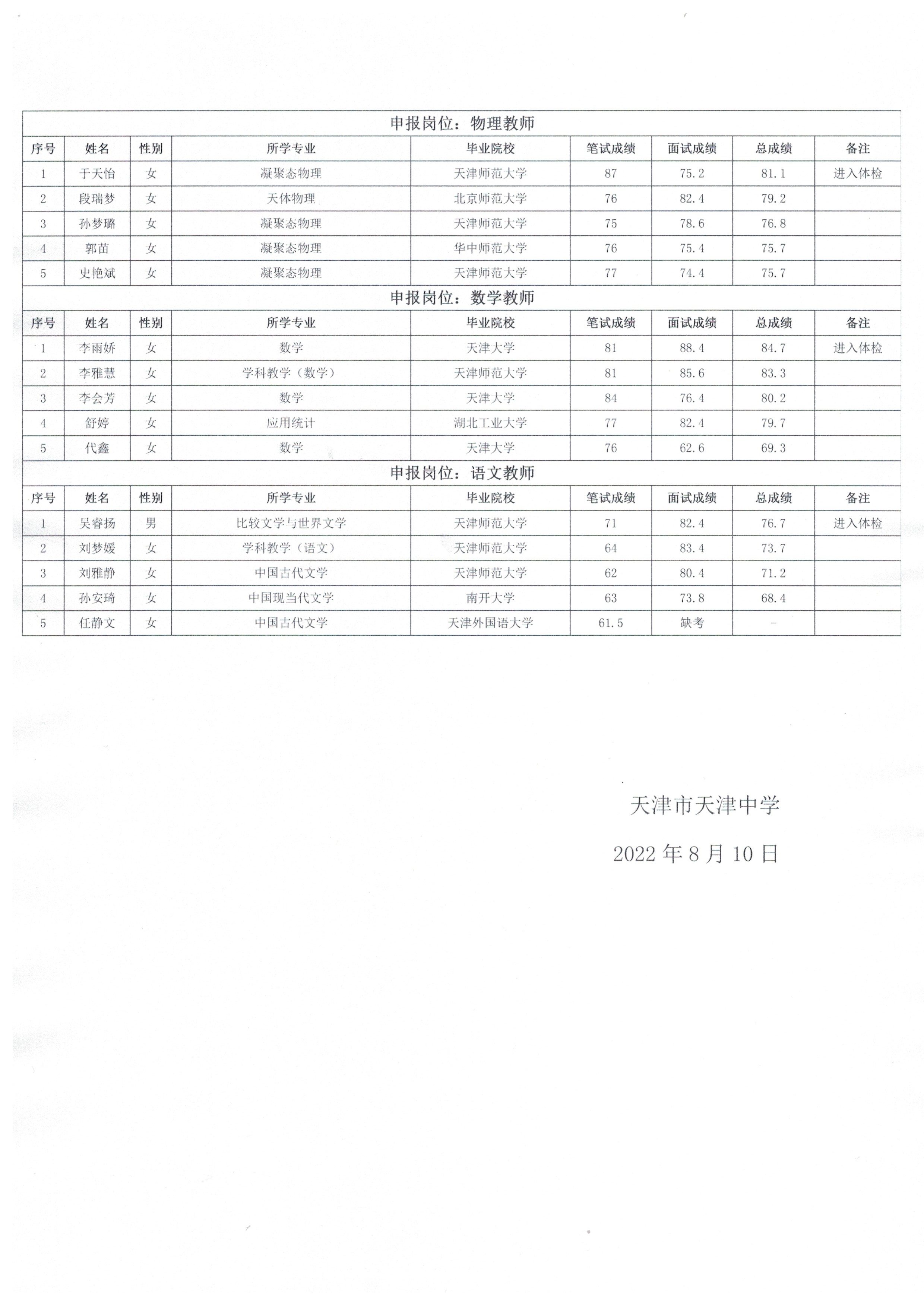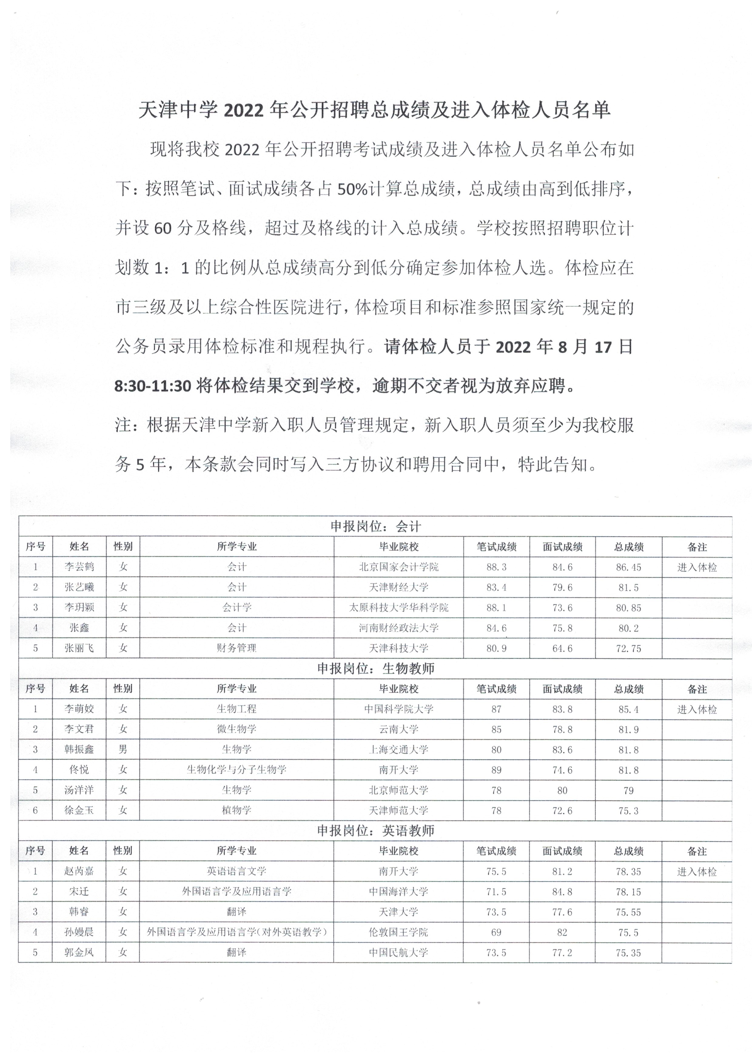 天津中学2022年公开招聘总成绩及进入体检人员名单