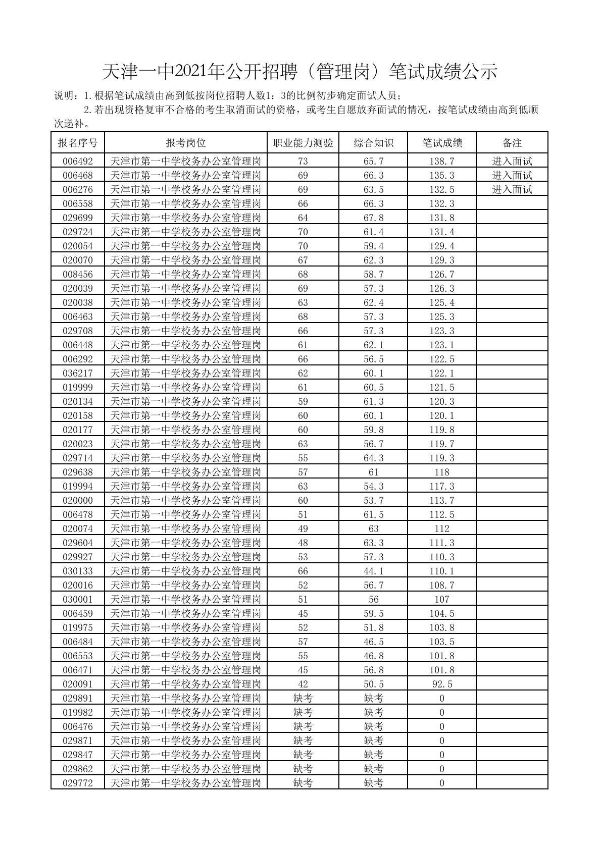 天津一中2021年公开招聘(管理岗)笔试成绩公示