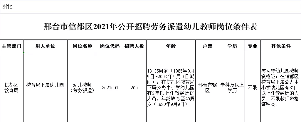 2. 《邢台市信都区2021年公开招聘劳务派遣幼儿教师岗位条件表》
