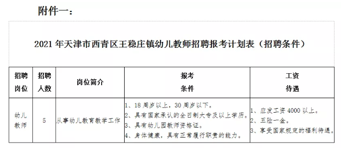 单位、岗位人数及资格条件等详见附件1《天津市西青区王稳庄镇幼儿教师招聘计划表》,应聘人员从2021年4月8日开始,可通过天津人才网(www.tjrenliziyuan.com)进行查询。