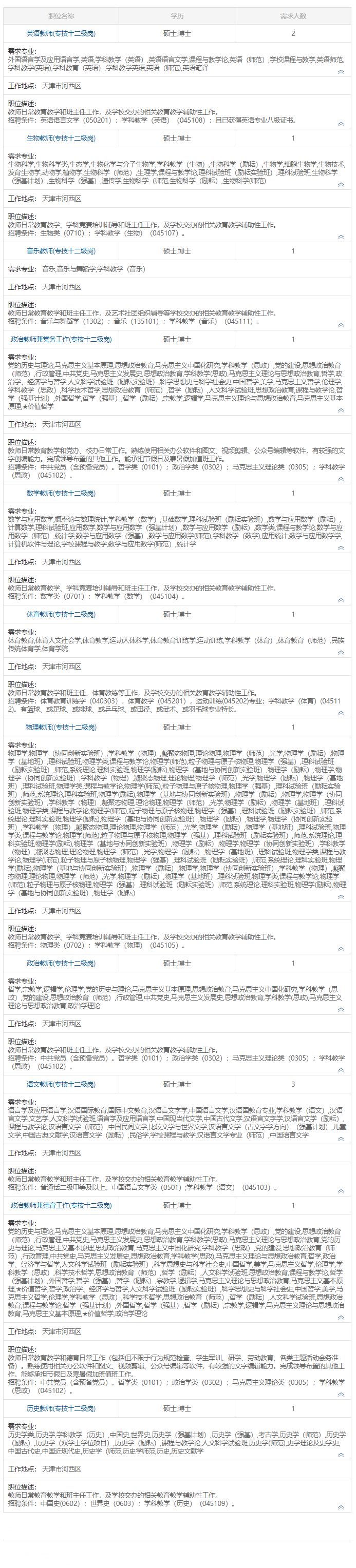 详见《2025年天津市实验中学教师岗位招聘计划表》