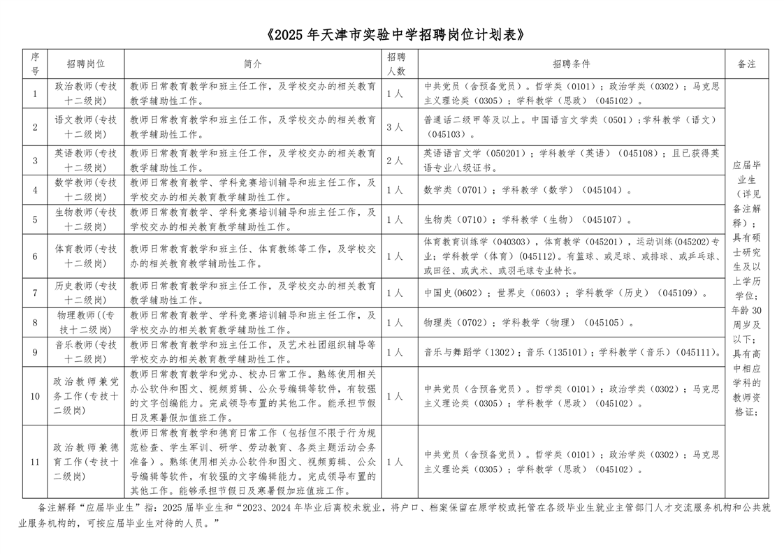 详见《2025年天津市实验中学教师岗位招聘计划表》