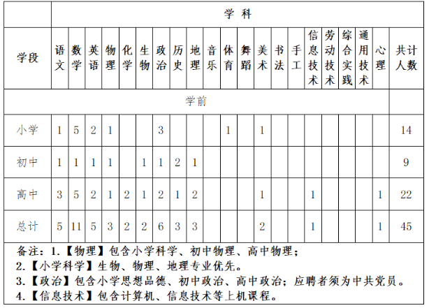 学校设小学、初中、高中三个学部,现有教学班共计77个,其中小学52个教学班、初中21个教学班,高中4个教学班,在校教职工总数270人。