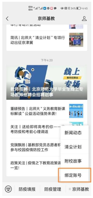第二步:进入微信公众号,点击菜单栏“京师基教”,选择“绑定账号”,按照相关提示完成操作(如下图)。