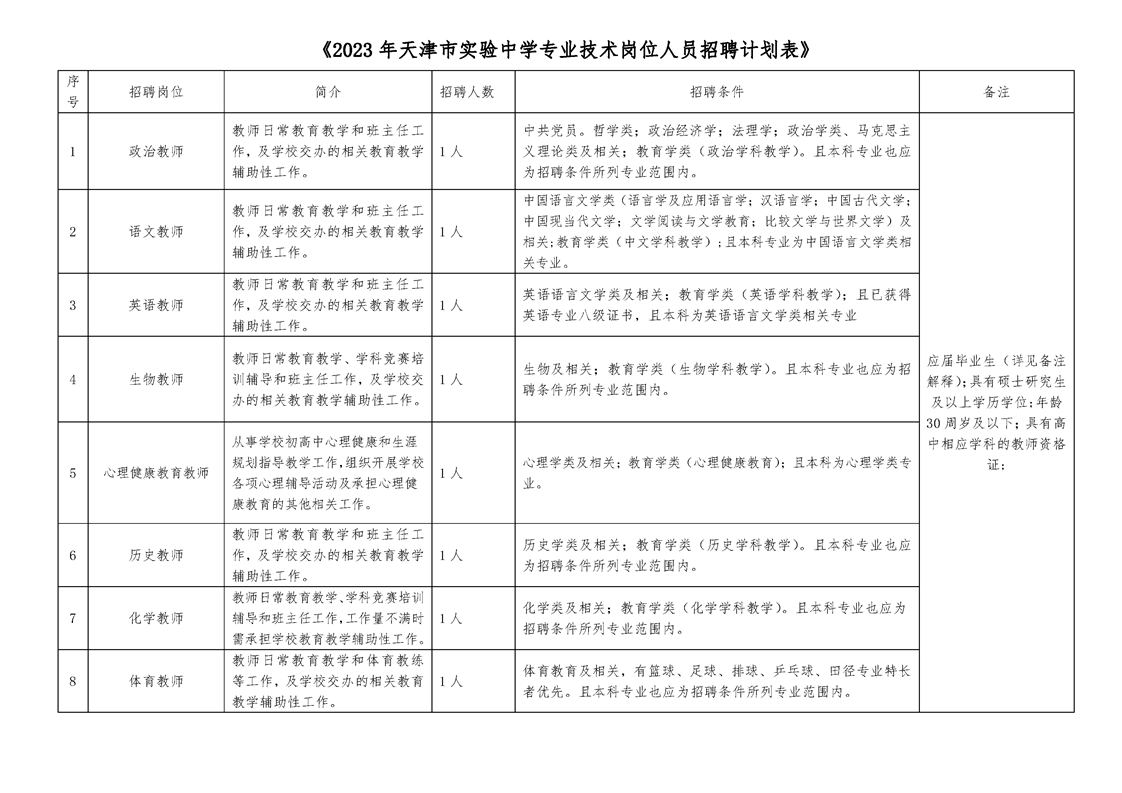 附件:2023年天津市实验中学专业技术岗位人员招聘计划表