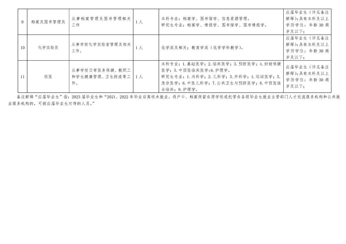 我校2023年拟招聘专业技术人员共11名,其中政治教师、语文教师、英语教师、生物教师、历史教师、心理健康教育教师、化学教师、体育教师、化学实验员、档案及图书管理员、校医各1人。
