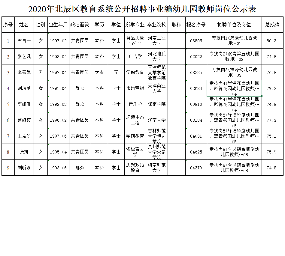 附件:2020年天津市北辰区教育系统公开招聘事业编幼儿园教师岗位公示表