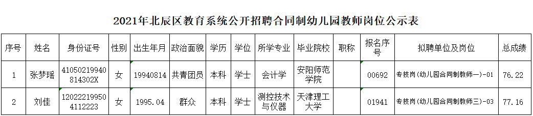 - 2021年天津市北辰区教育系统公开招聘合同制幼儿园教师拟聘用人