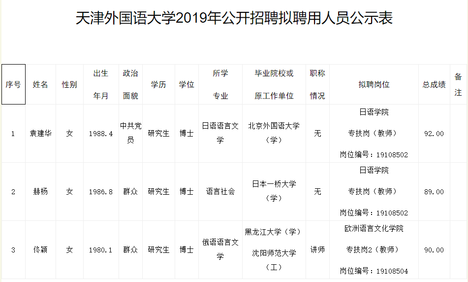 天津外国语大学公开招聘拟聘用人员公示