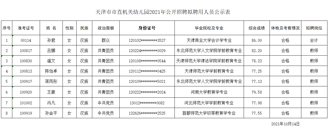 天津市市直机关幼儿园2021年公开招聘工作人员工作,经笔试、面试、体检、考察等环节,共8人符合条件。按照《天津市市直机关幼儿园公开招聘工作方案》现将拟聘用人员予以公示。