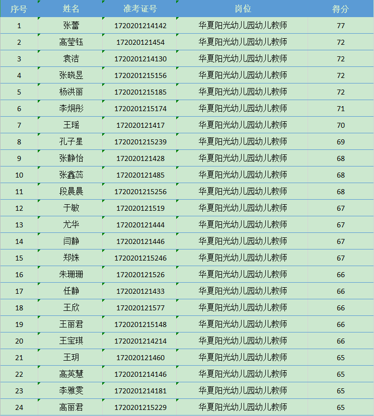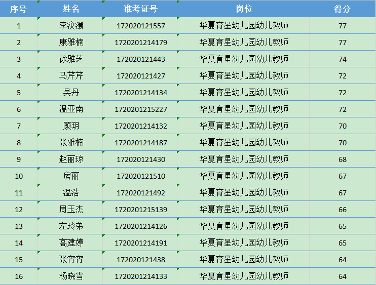 天津市西青区张家窝镇幼儿园教师、财务人员招聘考试笔试合格者成绩公示