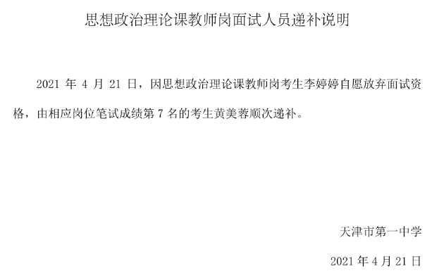 天津第一中学思想政治理论课教师岗面试人员递补说明