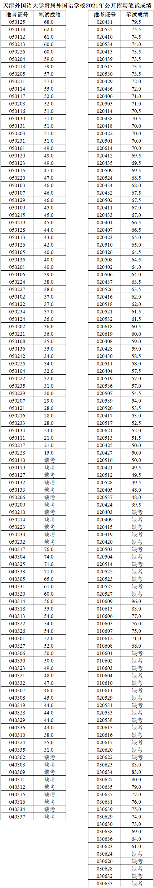 天津外国语大学附属外国语学校2021年公开招聘笔试成绩