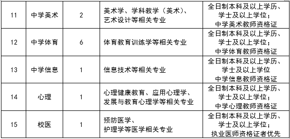 招聘年龄35周岁以下(截至到报名日期),全日制普通高等院校本科学历及以上学历,具有相应资格证书。教育教学经验丰富、有突出业绩者年龄可适当放宽。