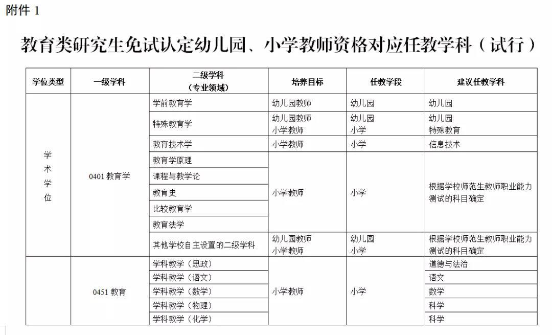 附件:1. 教育类研究生免试认定幼儿园、小学教师资格对应任教学科(试行)