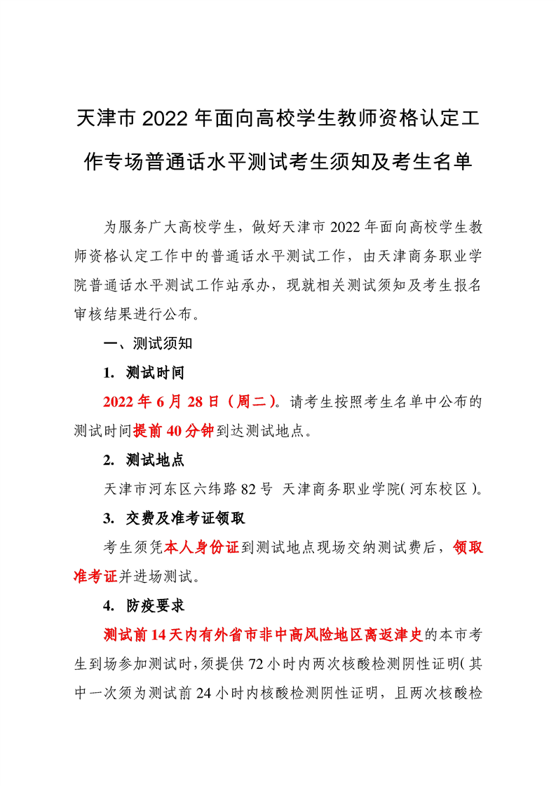 天津市2022年面向高校学生教师资格认定工作专场普通话水平测试考生须知及考生名单