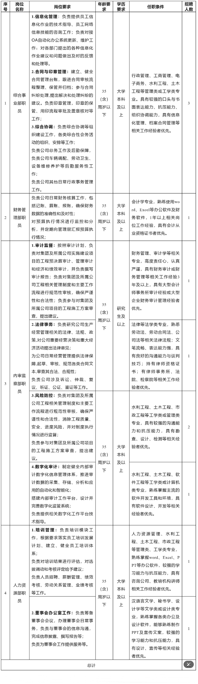 岗位招聘人数和岗位条件详见《廊坊市水务发展集团有限责任公司公开招聘工作人员岗位信息表》。