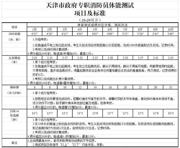 按照《天津市政府专职消防员体能测试项目及标准》(附件)执行。体能测试实行量化评分,单项有效成绩为1分~10分(未取得有效成绩的不予招录),总成绩最高40分。执勤车辆驾驶员需进行岗位适应性测试。岗位适应性测试单项成绩未达到“一般”标准的,不予招录。
