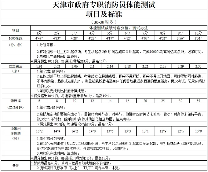 9.体能标准:参照《天津市政府专职消防员体能测试项目及标准》执行。