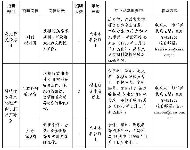 中国历史研究院于2019年1月成立,主要承担中国历史领域相关研究,推进中国特色历史学学科体系、学术体系和话语体系建设,统筹指导全国历史研究工作,展示和传播中国历史文化,组织国内外学术交流等职责。现根据工作需要,面向社会公开招聘非事业编制人员4人,具体事项如下: