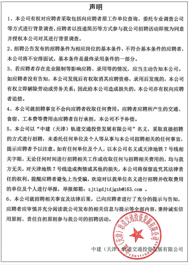 中建(天津)轨道交通投资发展有限公司招聘公告