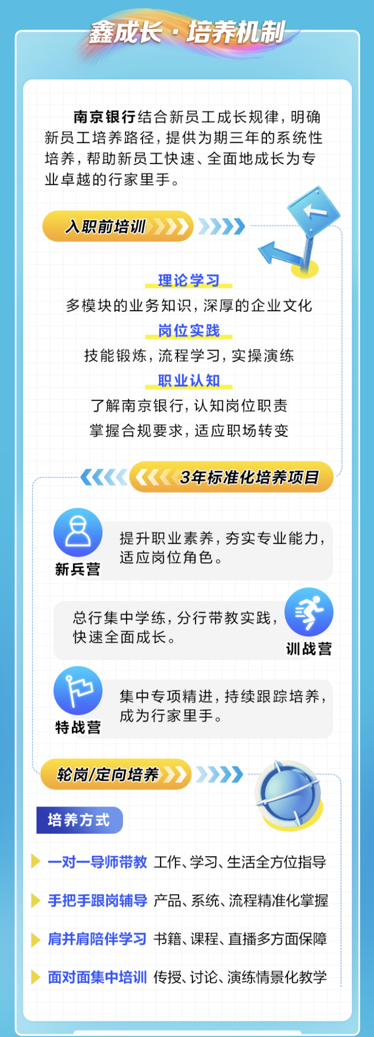 融科技共享生态沃土,主动锻造场景金融及营销平台工具,持续强化客户的体验感与获得感。我们风华正茂,不保追梦。我们秉承“人才是第一资源”的理念,建设了一支成熟稳定、高素质、专业化的人才队伍。全行干部员工平均年的34岁,本科及以上学历的员工占比超过99%,硕土及以上学历的员工占比接近349%,现代、职业、创新、乐活是我们的标签。我们积极践行“事业汇聚人才,奋斗成就未来”的人才理念,不断培养和股造人才。搭建覆盖全员的职业化、现代化学习培训机制,成立南京振行研修院,有效支撑了全行干部员工的成长与发展,增强了干部员工队伍的疑聚力与战斗力;提供为期三年的新员工全周期培养,帮助新员工认同企业文化、增进职业能力、提升专业水平,快速、全面地成长为卓校的行家里手,搭建管弹和专业的”型照业发展双通道,提供多元化的照业发展路径,给子员工京列内纵向置升和陪字列精向发展的机会,鼓励员工不断得升自身专业能力,实现职心发展,坚持战路导向、市场导询、价值导向和发展导向的管理原则,以岗位定空间、以能力走标准、以绩效定薪到的付薪理念,强调岗位、能力与绩效并重,建立全方位、广覆盖、多层次、宽领域的“盘福家”健康福利生态体系,着力实现员工准价值与公司事业的共同成长。我们为每一位奋斗者筑就拼搏奋进的舞台,让每一位员工更具获得感、幸福感和成就感。