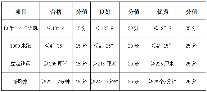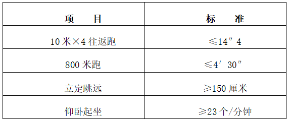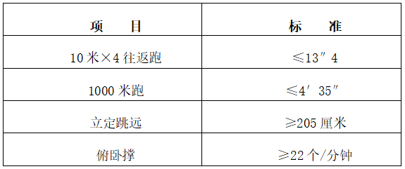 4.体能测评内容和标准:测评10米×4往返跑、立定跳远(可测2次)、俯卧撑(男)/仰卧起坐(女)、1000米(男)/800米(女)跑,共4个项目。合格标准如下: