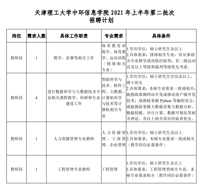 附件:天津理工大学中环信息学院 2021 年上半年第二批次招聘计划