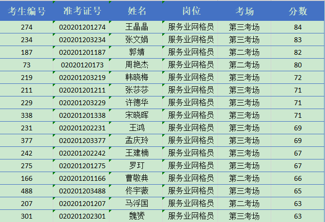 服务业网格员 笔试合格者名单