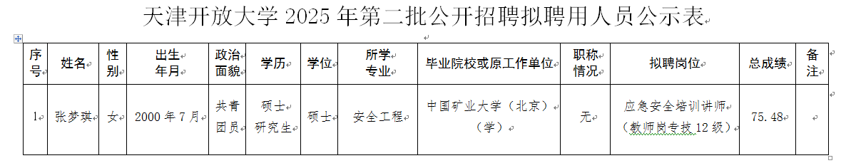 天津开放大学2025年第二批公开招聘拟聘用人员公示