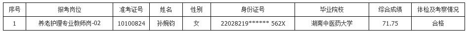 因养老护理专业教师岗-02 拟聘用人员王泽慧个人原因放弃,现根据2020年天津现代职业技术学院公开招聘实施方案进行递补,经过笔试、面试、体检、考察等程序,现对养老护理专业教师岗-02 递补人员进行公示,接受社会监督,名单如下: