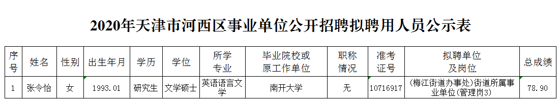 附:2020年天津市河西区事业单位公开招聘拟聘用人员公示表