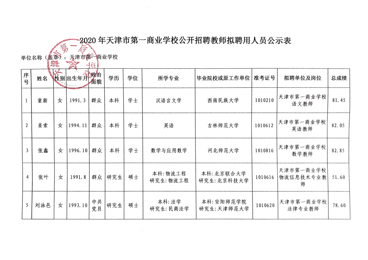 - 天津市第一商业学校公开招聘拟聘用人员公示