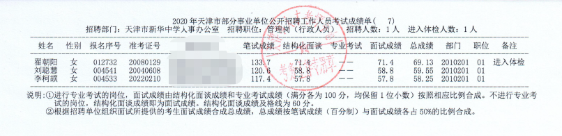 天津市新华中学2020年公开招聘行政人员总成绩公示