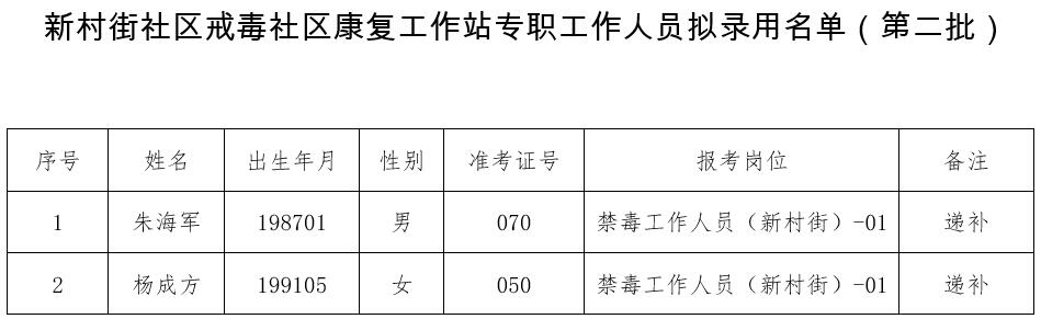 新村街社区戒毒社区康复工作站专职工作人员招聘拟聘用人员公示(第二批)