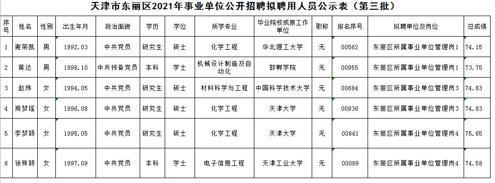 附件:天津市东丽区2021年事业单位公开招聘拟聘用人员公示表(第三批)