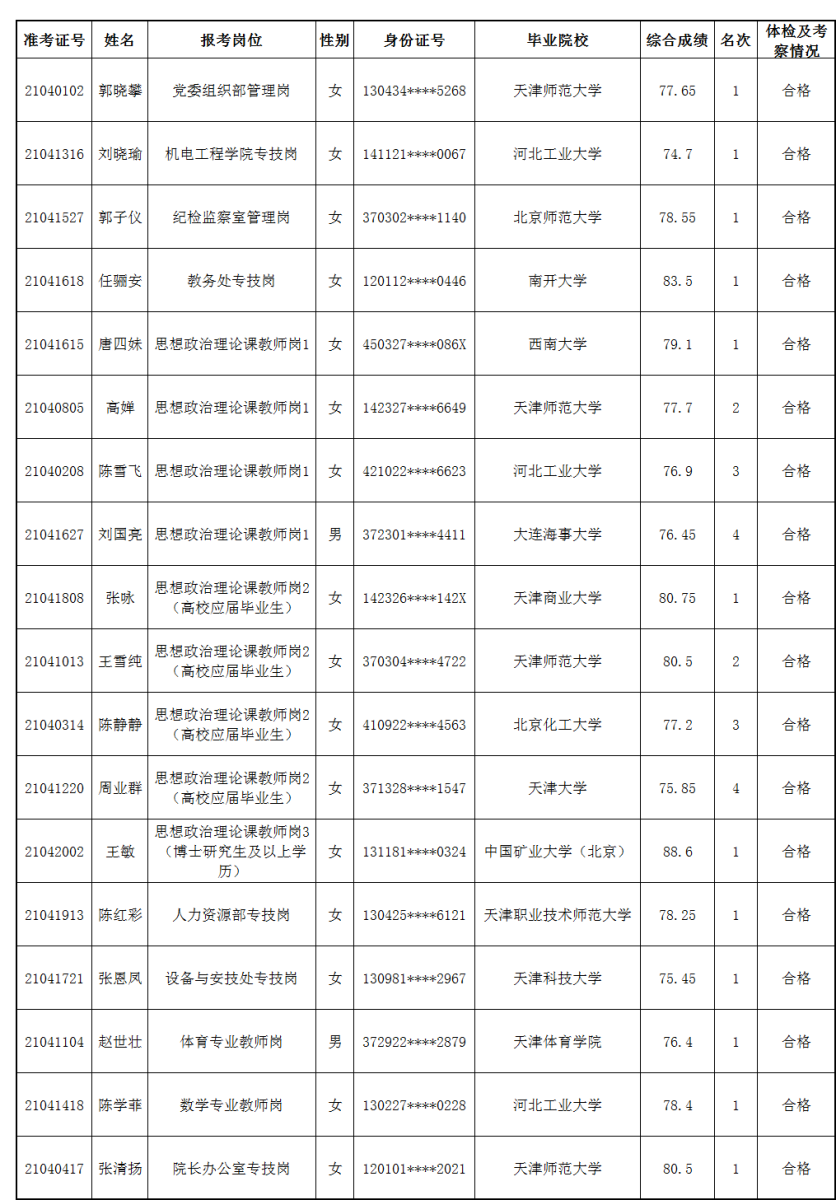 根据2021年天津现代职业技术学院公开招聘实施方案要求,经笔试、面试、体检、考察等程序,现对拟聘用人员进行公示,接受社会监督,名单如下: