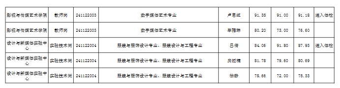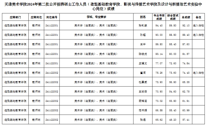 按照《天津美术学院2024年第二批公开招聘硕士工作人员方案》的工作安排,现将造型基础教育学院教师岗(岗位编号241122001241122002)、影视与传媒艺术学院教师岗(岗位编号241122003)及设计与新媒体实验中心实验技术岗(岗位编号:241121004)成绩公布事宜及相关安排通知如下: