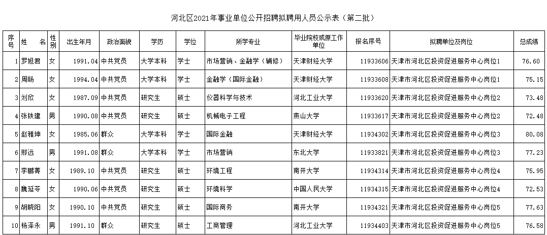 河北区2021年第二批事业单位公开招聘工作人员,经报名、笔试、面试、体检、考察等环节,共计10人符合条件,按照《河北区2021年第二批事业单位公开招聘工作人员公告》,现将拟聘用人员予以公示。