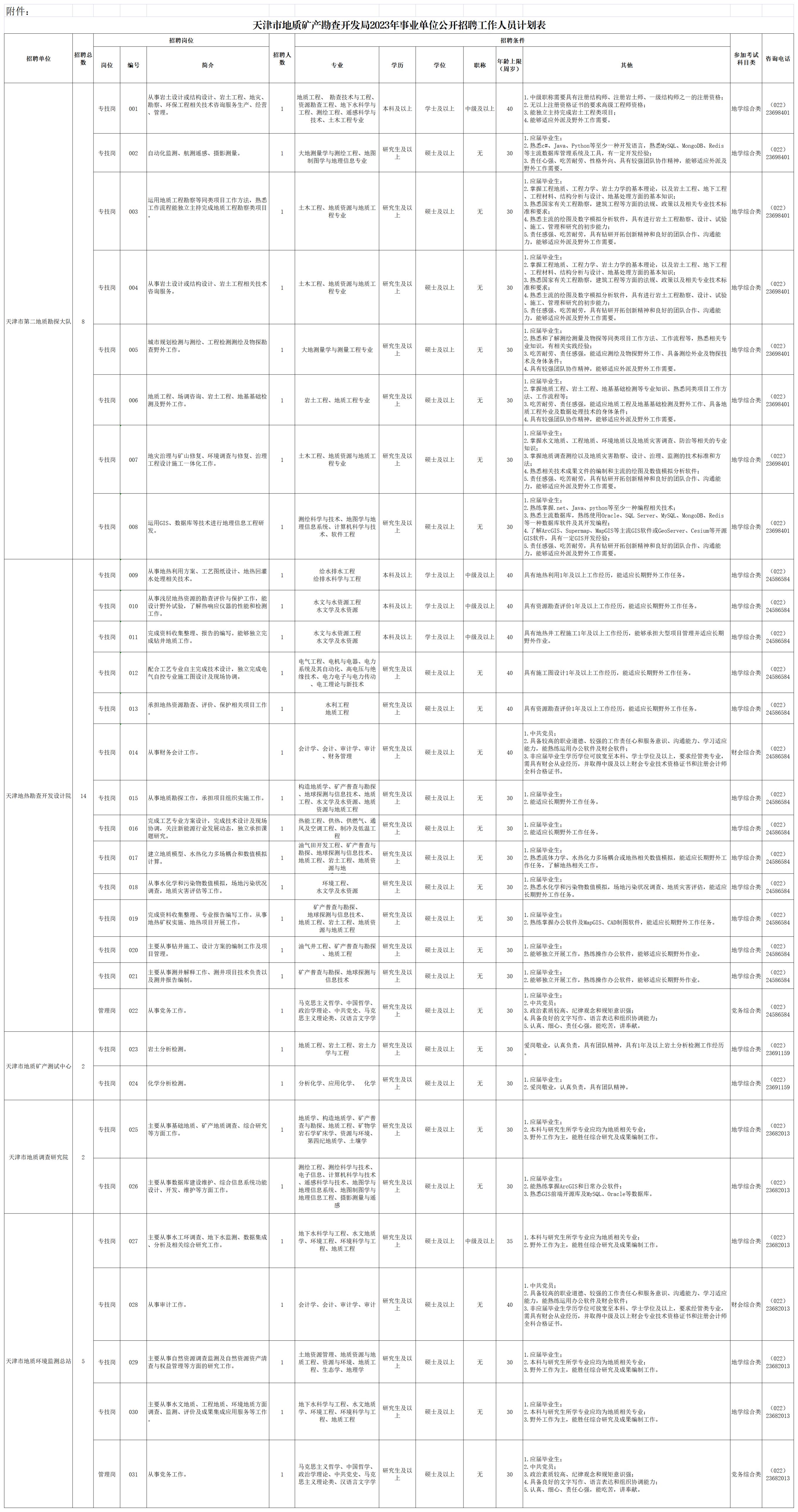 附件:《天津市地质矿产勘查开发局2023年事业单位公开招聘工作人员计划表》